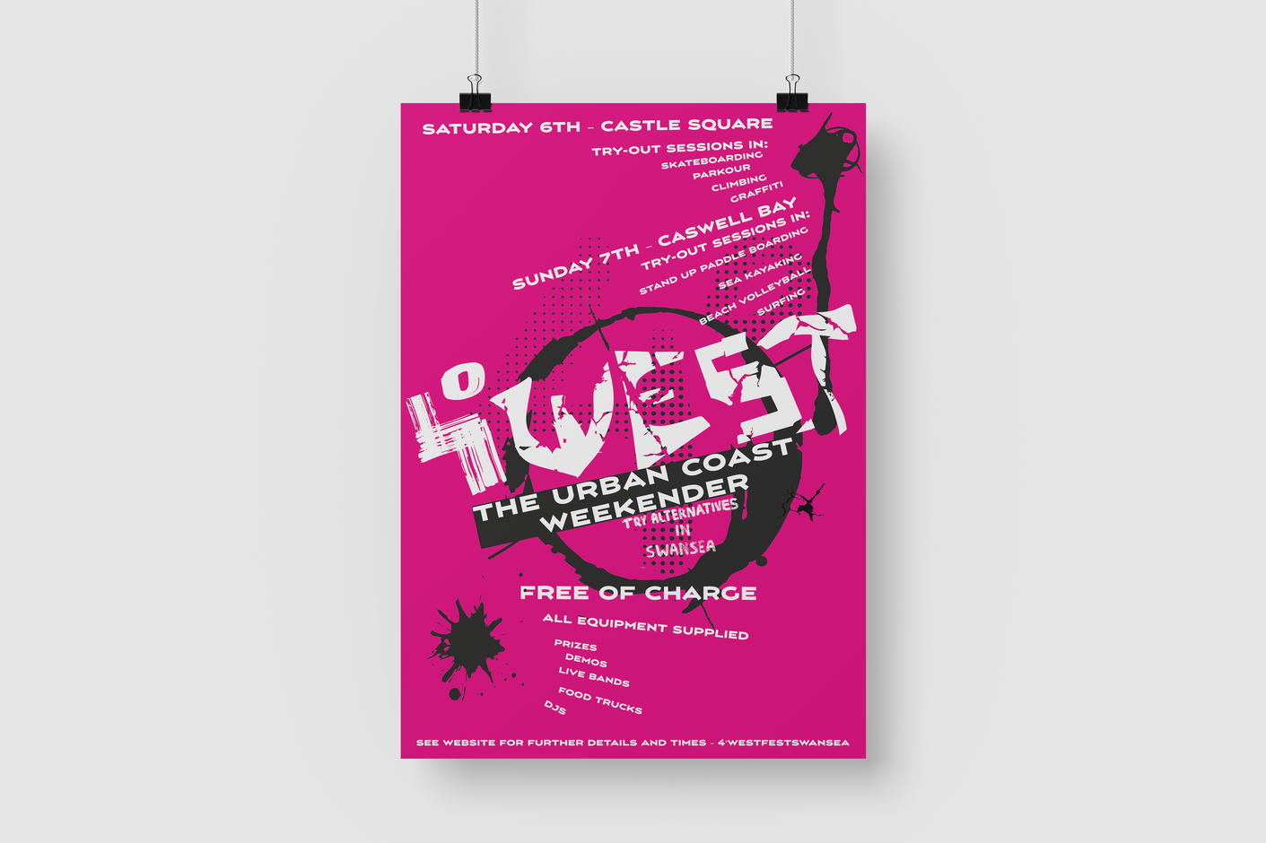 This project involved creating a dynamic and edgy visual identity for "4° West", a conceptual urban and coastal sports weekender held in Swansea. The festival combines activities like skateboarding and graffiti with surfing and paddleboarding, targeting a young, alternative audience.