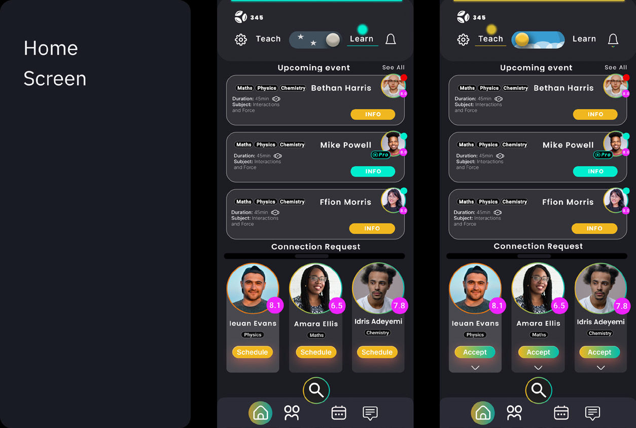 The user interface was designed to be intuitive, accessible, and engaging. A key innovation is the cascading system architecture, separating the interface into distinct brand, content, and navigation layers. This modular design allows for easy updates and scalability. Key UI features include an animated switch to toggle between 'Teach' and 'Learn' modes and an empathetic rating system that builds trust by focusing on positive attributes rather than criticism.